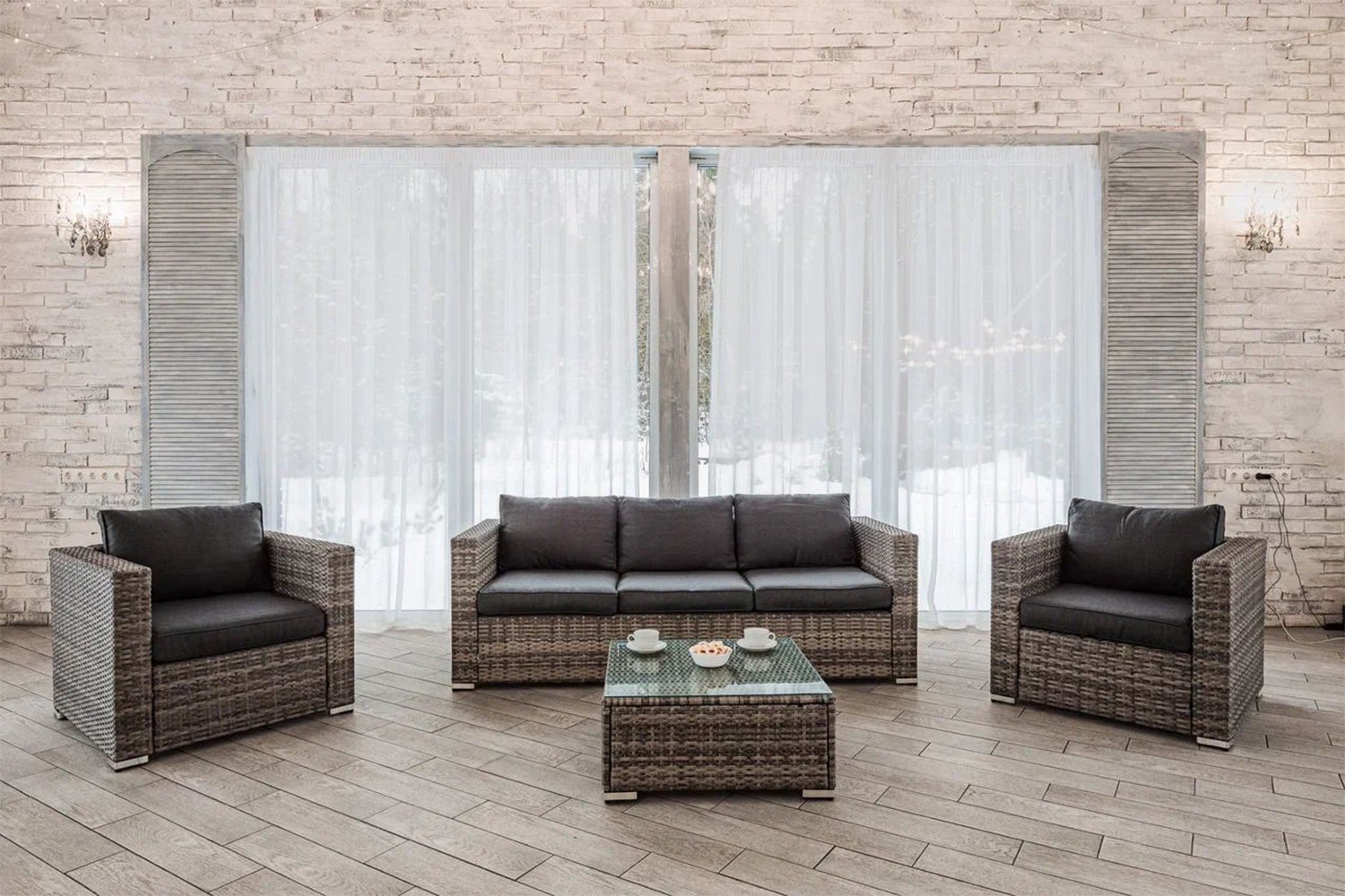 В набор «Карл» входит трехместный диван 204х66х84 см, два кресла 85х66х84 см и небольшой журнальный столик, предназначенный для напитков и закусок, который не будет отвлекать лишнее внимание - 70,5х31х70,5 см. Все элементы мебели выполнены в одном стиле, и из одних и тех же материалов – стальной каркас, скрытый оплеткой из искусственного ротанга серого цвета. Дополнительный материал – стекло – используется для создания столешницы.