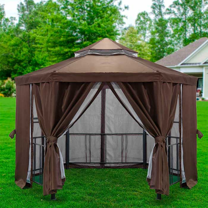 Хотим предложить вам купить тент на шестиугольный шатёр. Данная крыша-тент выполнена в коричневом цвете, она двойная, имеет клапан для проветривания, который также защищён москитной сеткой.