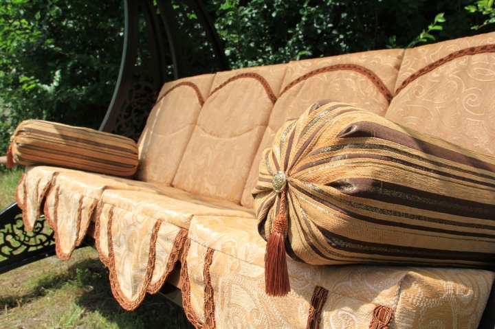 Это мягкая часть для качелей, благодаря ей вы сможете насладиться отдыхом на своей садовой качели полноценно. В мягкую основу включены скреплённые друг с другом части, которые при необходимости с лёгкостью можно отсоединить. В комплекте находятся две подушки-валика, выполненные в арабском стиле. Размер составляет 180 на 100 см, а толщина поролона составляет 10 см. Из преимуществ данного изделия можно выделить то, что оно сделано из очень плотной и прочной ткани, которая обладает высокой износостойкостью. Ее с легкостью можно почистить, а также достаточно трудно растянуть.